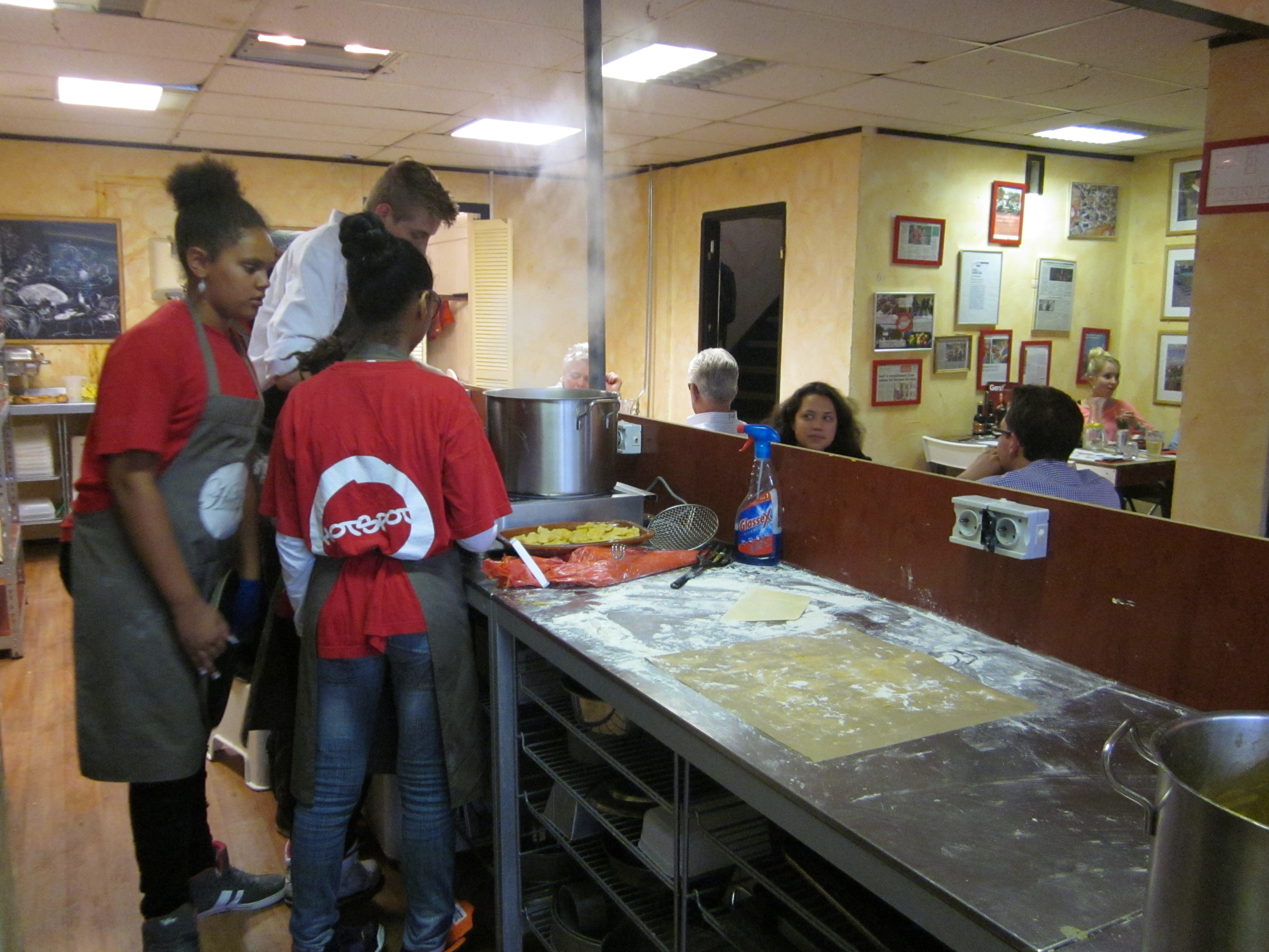 Om 15u30 staan er zeven meiden voor de deur aan de Dumasstraat. Zij komen vandaag koken. Het restaurant kan dagelijks ruimte maken voor zeven tieners in de keuken. Eerst wordt de boel mise en place gemaakt. Hoewel geen van de meiden het een leuk klusje vindt (“mijn ogen gaan altijd zo tranen!”), worden er talloze uien gesnipperd. Voordat de eerste gasten arriveren eten de chefs gezamenlijk een gezonde maaltijd volgens de schijf van vijf. Zelfs het brood komt uit eigen keuken. Laat die gasten nu maar komen!