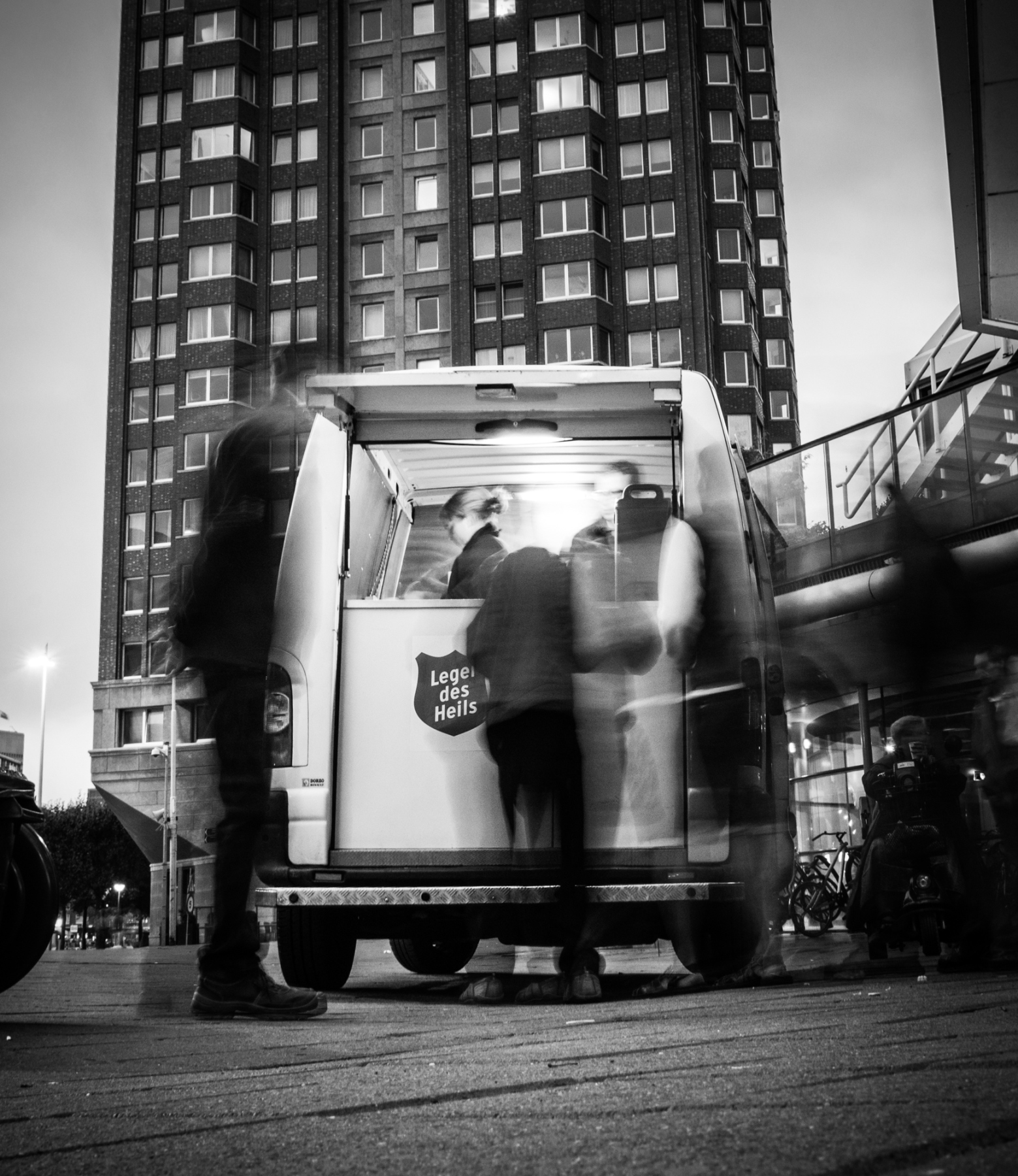 Onze nacht in de OQ zit er weer op. Tony houdt galant de deur voor ons open en we bedanken de mannen voor hun gastvrijheid. Voordat we naar buiten stappen zien we nog net de jongen uit Delft met een langbenig Pools meisje naar boven lopen.
