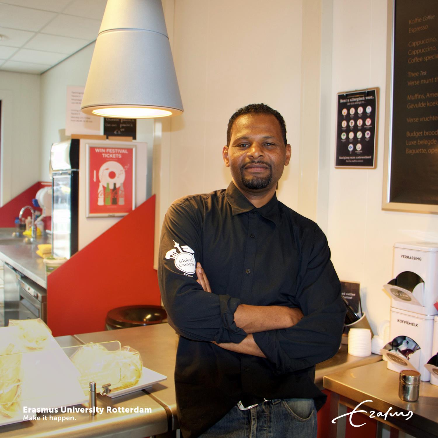 “Write something about me? I am just a regular guy, born in Ethiopia and when I was 18 I came to the Netherlands. I’ve been working at Erasmus University for thirteen years now. Thirteen years, can you believe it? I started out as a truck driver and now I am working in catering. In 13 years I got to know everyone! You know, I’m happy here, at Woudestein. It feels like home. Every morning I start work at 6.30, open my shop and bake bread. When students enter the shop I say: ‘Look, here are my children.’ I really say that, just ask my colleague. Even if another employer paid me 1000 euro extra each month, I still wouldn’t leave this place. Feeling good at what you do is more important than making money. Would you like a coffee? And a cake to go with it?”